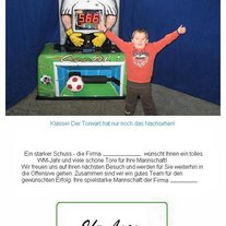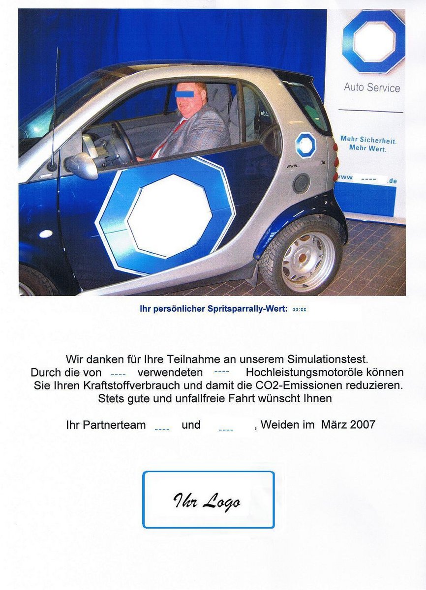 Dieser "Fotoautomat" besteht aus einer hochwertigen Digitalkamera mit Farblaserdrucker und PC/Laptop mit spezieller Software zum Ausdruck von "Urkunden". Der Werbetext der "Urkunden" ist wählbar und es kann Ihr Logo eingebaut werden. Knapp die halbe Din A4 Seite der "Urkunde" schmückt ein farbiges Erinnerungsfoto Ihres Kunden, natürlich am besten mit Ihrem "Produkt". Die "Urkunde" wird Ihrem Kunden als kleines "Präsent" überreicht.